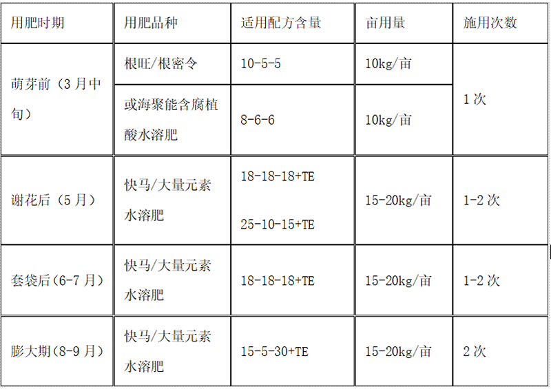 科學研究表明,每生產1000公斤蘋果,約需要吸收(折純)氮4-6公斤,磷2-3公斤,鉀6-8公斤,鈣3-4kg、鎂1.5-2kg,硫0.4-0.5kg,同時還應滿足硼鋅鐵等微量元素的供應。