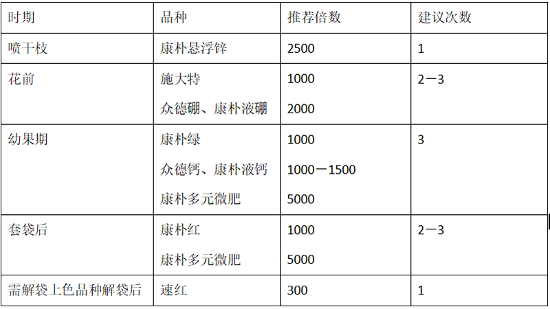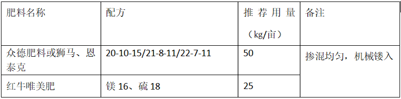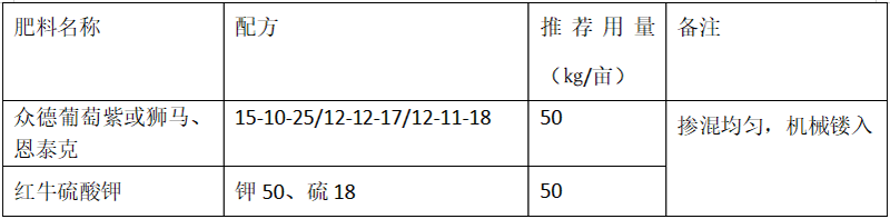 (2)推薦施肥套餐(根據(jù)目標(biāo)產(chǎn)量、地域、品種、樹(shù)勢(shì)、樹(shù)齡、地力等適當(dāng)調(diào)整)