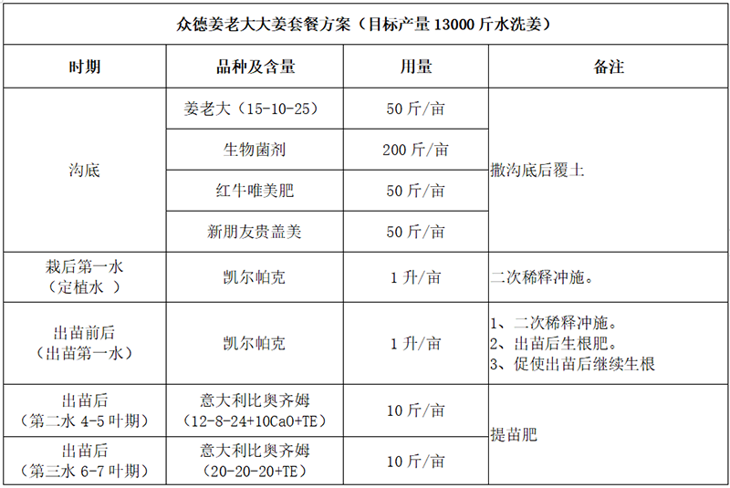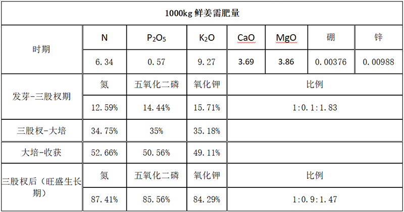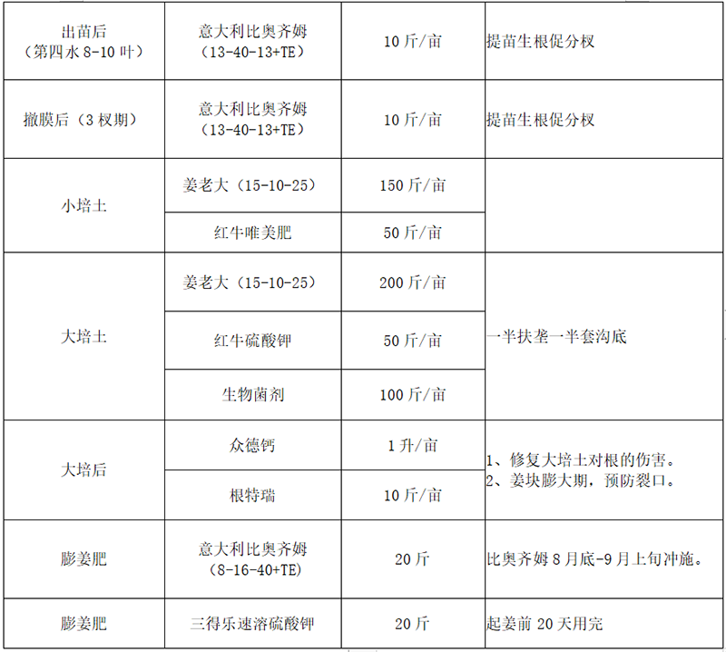 (2)大、中、微量元素兼顧:大姜除對氮磷鉀的需求外,對鈣、鎂需求也很大,中量元素鈣鎂及微量元素應早施。