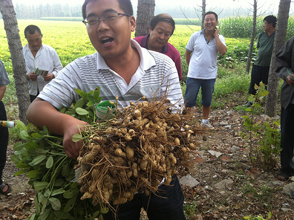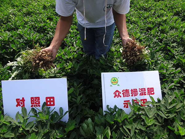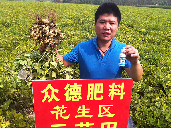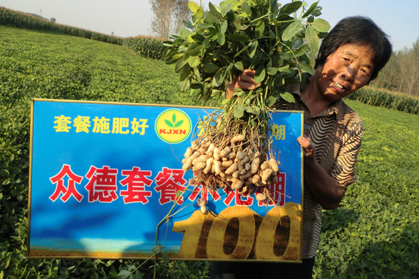 沂南縣辛集北左泉村農民顧守武,去年用眾德(16-12-14)120斤/畝,生物有機肥80斤/畝,新朋友貴蓋美30斤,持力硼2袋,在翻地前一次性施入,到9月10號收獲期測產1173斤,與對照田產量1055斤相比,畝增產118斤,增產幅度11.2%。顧先生滿臉喜悅的說:“用眾德花生高產套餐方案效果非常好,歸功于眾德系列肥料原料考究,配方合理,營養全面,對于重茬、土壤酸化等問題障礙能夠得到有效解決,改良并活化土壤,特別是態康科、康樸系列葉面肥,能促進花生根系和葉片生長,補充硼、鉬、鈣等中微肥,提高座果率、改善品質,提高產量,農民最終獲得收益。